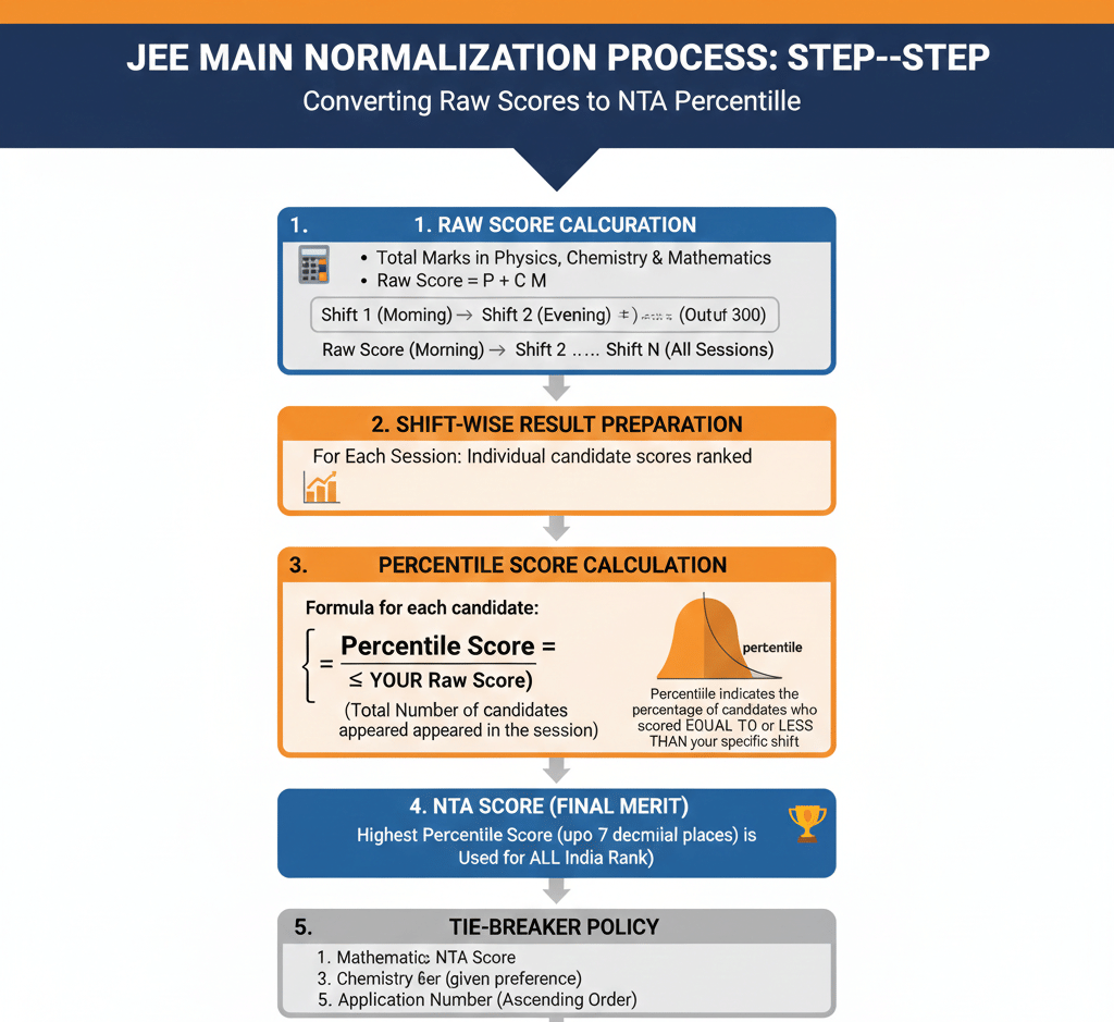 Normalisation Process: JEE Main is conducted across multiple sessions throughout the year. The difficulty level of the question paper might vary slightly between sessions. To ensure fairness and equal opportunity for all candidates, the NTA employs a normalisation process to account for these variations. This process transforms the raw scores obtained by candidates in each session into a scale ranging typically from 100 to 0.