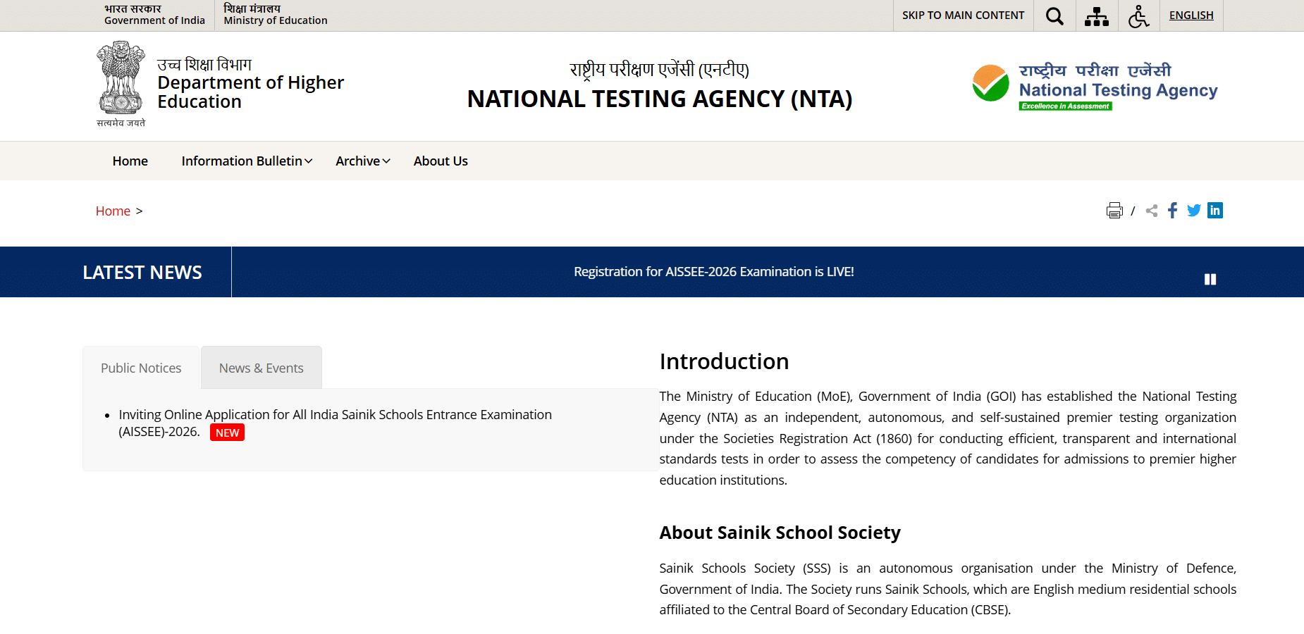 ऑल इंडिया सैनिक स्कूल एंट्रेंस एग्जाम की ऑफिशियल वेबसाइट