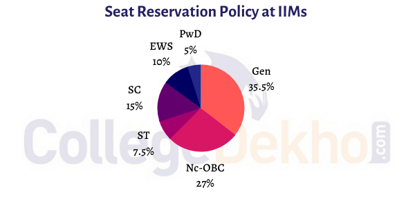 - IIM अपनी 15% सीटें अनुसूचित जातियों (एससी) के लिए, 7.5% अनुसूचित जनजातियों (एसटी) के लिए और 27% 'गैर-क्रीमी' परत (एनसी-OBC ) से संबंधित अन्य पिछड़ा वर्ग के लिए रिजर्व्ड रखते हैं। ईडब्ल्यूएस श्रेणी के उम्मीदवारों के लिए 10% रिज़र्वेशन है।
