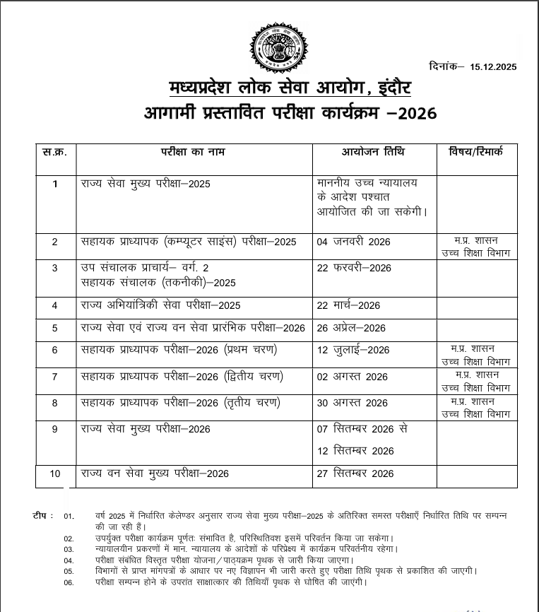 एमपीपीएससी एग्जाम के लिए रिवाइज्ड कैलेंडर जारी किया गया है जिसमें एग्जाम डेट अगस्त 2025 से दिसंबर 2025 शेड्यूल्ड है।