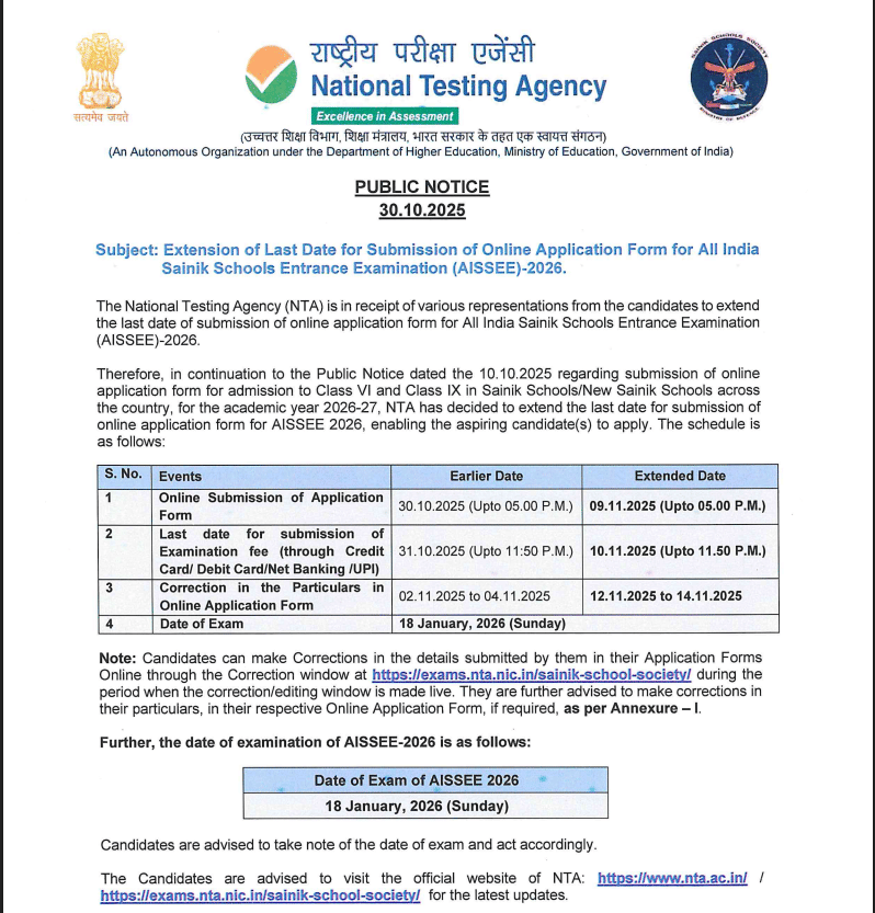 सैनिक स्कूल एडमिशन 2026 (Sainik School Admission 2026 in Hindi): AISSEE सैनिक स्कूल एग्जाम डेट 2026 (AISSEE Sainik School Exam Date 2026) जारी कर दी गयी है। सैनिक स्कूल एंट्रेंस एग्जाम 2026 (Sainik School Entrance Exam 2026) 18 जनवरी, 2026 को आयोजित किये जायेंगे। नेशनल टेस्टिंग एजेंसी द्वारा ऑल इंडिया सैनिक स्कूल एंट्रेंस एग्जाम (AISSEE 2026) के लिए AISSEE 2026 नोटिफिकेशन के साथ ही सैनिक स्कूल एप्लीकेशन फॉर्म 2026 ऑफिसियल वेबसाइट exams.nta.nic.in/sainik-school-society पर जारी किये गये थे। क्लास 6 और क्लास 9 के लिए सैनिक स्कूल एडमिशन 2026 एप्लीकेशन फॉर्म (Sainik School Admission 2026 Application Form in Hindi) आप 10 अक्टूबर 2025 से भर सकते थे। सैनिक स्कूल एडमिशन 2026 के लिए रजिस्ट्रेशन की लास्ट डेट बढ़ा दी है, पहले आवेदन करने की आखिरी तारीख 30 अक्टूबर 2025 तय की गई थी, लेकिन अब उम्मीदवार 9 नवंबर 2025 तक रजिस्ट्रेशन कर सकेंगे। छात्र 12 नवंबर से 14 नवंबर 2025 तक सैनिक स्कूल एप्लीकेशन फॉर्म में करेक्शन कर सकते हैं। सैनिक स्कूल एडमिशन ऑनलाइन एप्लीकेशन 2025-26 (Sainik School Admission Online Application 2025-26 in Hindi) डायरेक्ट लिंक, महत्वपूर्ण डेट और ऑनलाइन एडमिशन फॉर्म कैसे भरें इसकी जानकारी यहां उपलब्ध कराई गई है।