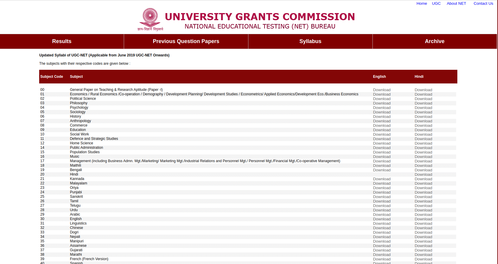 यूजीसी नेट सब्जेक्ट लिस्ट