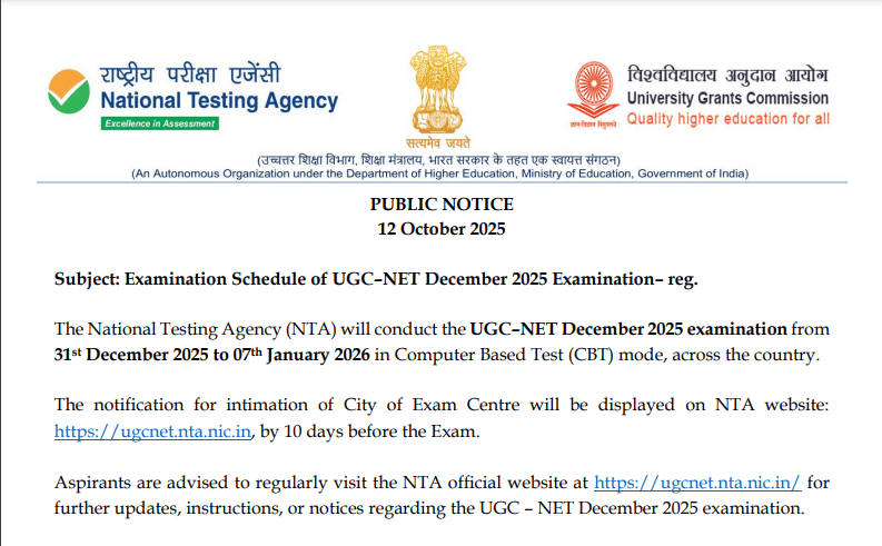 यूजीसी नेट 2025 दिसंबर नोटिफिकेशन डेट | अक्टूबर 2025 |
